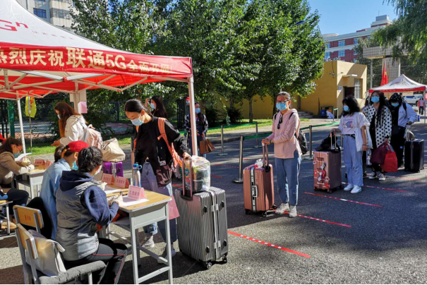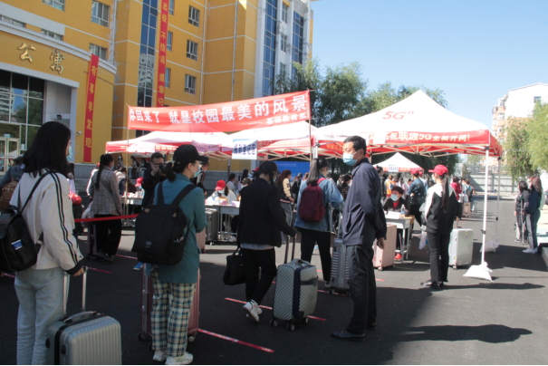 七月的风,八月的雨,都抵不过重逢九月的你。从飘雪的一月,到金色的九月,200多个日夜,学子们终于重逢在校园。拖着行李箱回到校园,走在整洁而熟悉的小路上,她们百感交集……虽然每个人戴着口罩,但也难掩眼角眉梢的笑意,眼中闪烁着激动的光芒;虽然登记队伍、检测队伍排着长龙,但每位同学都听到了老师们亲切的问候着:“同学你好,欢迎回校!”学生们也不忘说一句“老师好!谢谢老师,您辛苦了!”