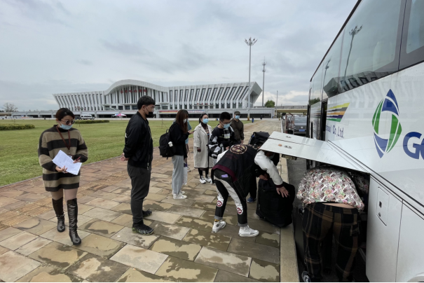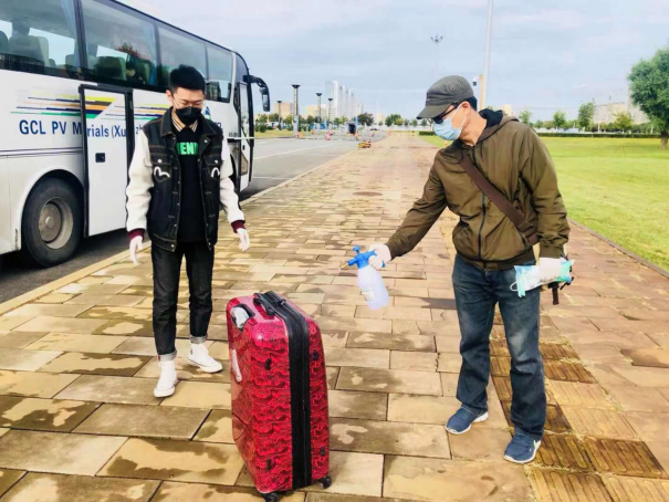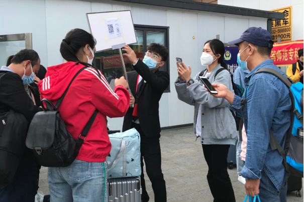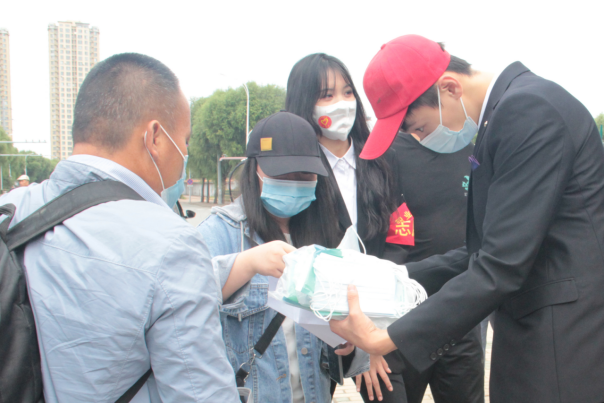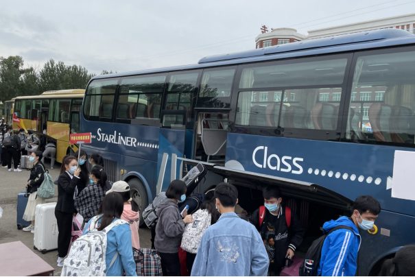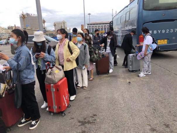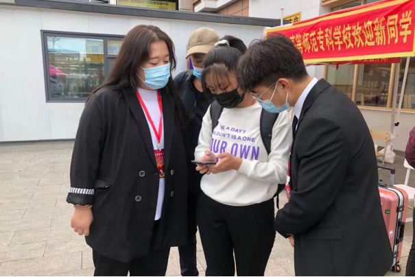 清晨,志愿者们早早的在机场和车站等候着新生的到来,经过扫码、测温、消杀、更换口罩,学生乘坐接站车来到了温馨美丽的师专校园。