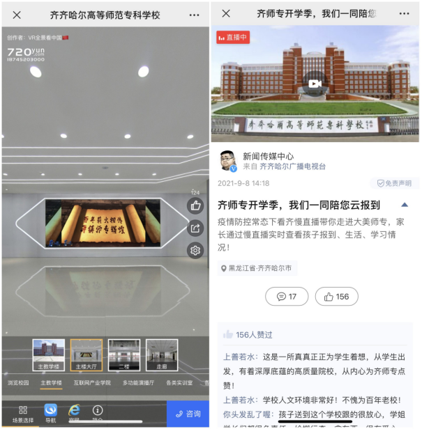 由于疫情原因,家长不能进入校园。学校制作了VR全景,新生和家长可以使用手机就能够看到学校的整体风貌,体会学校事业向前、环境向美、风气向好、人心向上的发展态势。