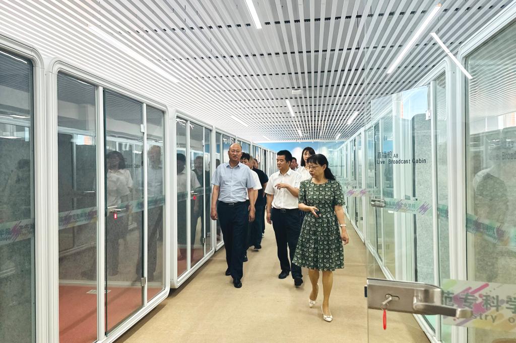 孙恒一行首先来到教学主楼,观看了我校宣传片,了解学校历史、基本情况及近年来发展变化,特别是重点了解我校今年毕业生就业情况及招生情况。在互联网产业学院,我校辅导员正进行暑期集中业务培训,工作人员介绍了学院建设、使用情况及各区域功能特点,并着重介绍互联网产业学院的授课模式、实训模式及人才培养模式,以及场地、设备利用率,对外合作情况,策划、制作、直播等电商“全链条”服务模式的建设成果。随后孙恒一行来到校体育场,实地查看校园环境。在正在建设中的学生公寓项目现场,详细了解项目建设分布及施工进度,指出要严把项目安全关、进度关和质量关,努力为学生们营造现代、安全、舒适、温馨的公寓环境。