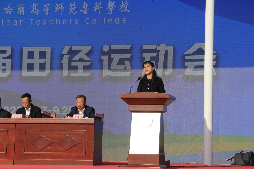 邹凤玲宣布齐齐哈尔高等师范专科学校第十四届田径运动会开幕。