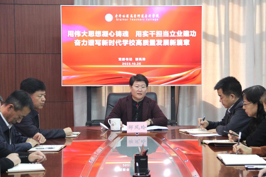 邹凤玲强调,要坚持不懈用习近平新时代中国特色社会主义思想武装头脑、指导实践、推动工作,全面贯彻新发展理念,奋力开辟创新发展新赛道。习近平总书记强调“职业教育与经济社会发展紧密相连,对促进就业创业、助力经济社会发展、增进人民福祉具有重要意义。”特别是这次总书记视察我省时关于发展职业教育的重要指示,为大力发展职业教育指明了方向。我们必须牢牢把握新发展理念,找准自身发展定位,抢抓机遇、乘势而上。要完整准确全面贯彻新发展理念,把握学校阶段性特征和发展趋势,找准发展定位、服务面向,做好顶层设计。要聚焦影响高质量发展主要矛盾问题的关键点和制约点,合力攻坚克难、破解难点难题,打好推动问题整改攻坚战。要用好解放思想这把“金钥匙”,瞄准更高的标准、谋划更实的举措,激发凝聚各方力量,努力开创学校高质量发展新格局。要抬高思想站位,胸怀大局、抢抓机遇。要勇于除弊革新,增强动力、激发活力。要准确把握时代脉搏,全面加强党的领导,持续推进体制机制、专业布局、人才培养、师资结构、后勤保障、资源配置、内部治理等一系列综合改革,推动结构性转换和创新能力构建,持续激发核心竞争力和发展活力。要赓续红色血脉,内练硬功、外树形象。围绕“培养什么人、怎样培养人、为谁培养人”这个关键问题,擦亮“龙江师范第一校”的时代使命和历史重任。切实加强校园文化建设,发挥校史育人作用,传承好老一辈师专人的崇高精神和高尚品质,弘扬“重教爱校、奉献求索”的师专精神,塑造起新时代师专新形象。努力建设成为学生向往、群众认可,有社会知名度的高职高专院校。要坚持质量立校,拓宽赛道、创新发展。突出教育教学工作中心地位,不断增进学校发展与区域发展需求的适应度,坚持“守正提升、创新做强”发展思路,逐步形成多元化的办学格局,实现结构、规模、质量和效益协调发展,打通学校高质量创新发展的新赛道。