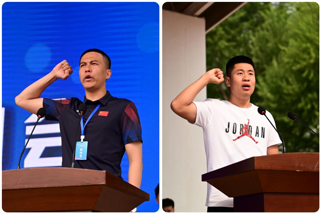 体育系体教221班孙永康代表裁判员宣誓,基础教育一系小教233班李泉威代表运动员宣誓。