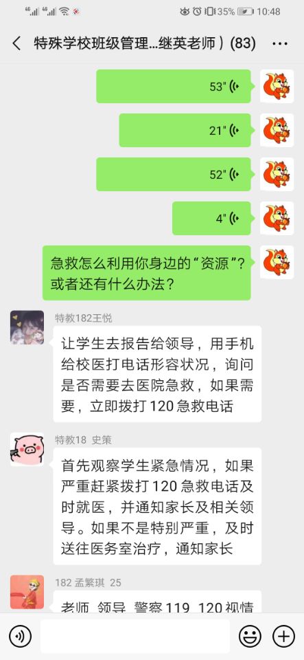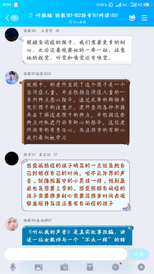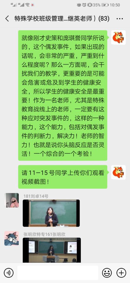 三、认真做好线上辅导。殷继英老师给学生布置爱课程网络线上的学习内容,然后在微信群里讲解、指导、答疑,通过提问、讨论、学生视频截图、记笔记、作业等进行反馈。学生签到及时,出勤率高。学生能够积极思考,学习主动学生能够理解书本上的理论知识,并能结合特殊教育基本理论学习班级管理这门课程。比如在探讨特殊教育学校和一般普通学校偶发事件的重要性、概率的探讨时,同学们回答积极踊跃,回答准确。都能够将自己的理解用文字表达出来。