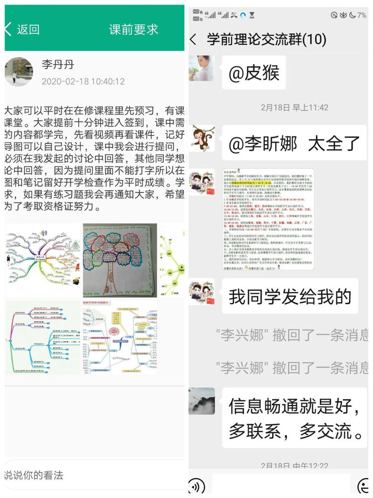 线上教学实践第一周后,所有教师都进行了认真的教学反馈。针对部分开展线上学习存在实际困难的学生如何解决困难?针对线上教学平台使用和技术问题如何熟练搭建操作?如何自行开发实用、学生乐于接受的线上课程资源?带着问题专业领导和伙伴们通过微信交流群,集思广益,交流商讨,有时到了深夜却仍在碰撞火花,在群里分享自己的意见和想法。