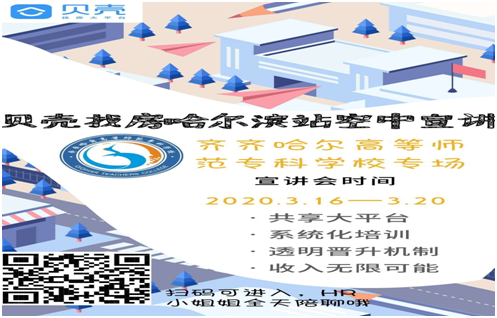 为了进一步贯彻落实党和国家关于做好2020届毕业生就业创业工作的文件精神,促进我校2020届毕业生充分就业,我校于3月16日至31日举办“网络双选会”。哈尔滨贝壳房地产经纪有限公司积极配合我校就业工作,在积极参与“网络双选会”的同时,于3月16日至20日举办了“贝壳找房哈尔滨站空中宣讲会齐齐哈尔高等师范专科学校专场”。空宣专场期间,我校毕业生浏览量达750人次,简历投递73人,线上面试60人,发放offer18人。
