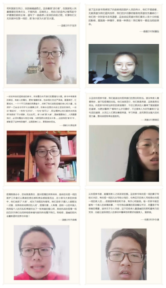 “我想与大家一起来分享交流《抗疫家书》,今年新冠肆虐,很多最美‘逆行者’在国家和人民最需要的危急关头,不惧风险,迎难而上,用自己的血肉之躯筑起守护健康的钢铁长城,谱写了一曲曲感人至深的战疫之歌……爱国是一种情怀,更是一种责任!我们青年一代应当担起使命。”来自基础教育系数教193班张静怡同学正通过钉钉平台和同学们进行读书阅读分享。