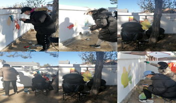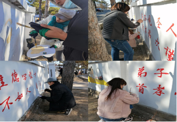 2020年10月23日上午9点,艺术传媒系美术教育191班5名学生在副主任卜欲婧、办公室主任郝晓萍和美术教研室主任盖凤丽老师的带领下来到距离学校24公里外的人民小学校外实习基地——查罕诺村。在风光秀丽、风景如画的小村庄,学生格外兴奋,也以最快的速度进入到了工作状态。在深秋室外温度接近0度的环境中,学生们身着羽绒服坚持绘制了6个小时,从铺大色调,到深入刻画,再到调整画面,他们都以饱满的精神投入,没有一丝懈怠。美术教育专业的学生在社会服务的过程中,展现了自己的特质:奉献、激情和良好的专业修养。这些学生能够不怕苦、不叫累,运用自己的专业知识,在气温较低的室外环境中坚持把墙画完,展现了良好的团队合作精神与敬业精神,也得到了人民小学领队教师的高度认可。