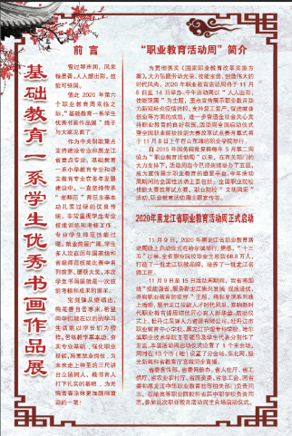 在2020年第六个职业教育周来临之际,为了激发学生师范技能训练兴趣和热情,提高师范生基本功,营造良好的技能训练和文化艺术氛围,丰富同学的业余生活,11月23日,“基础教育一系学生优秀书画作品展”在教学主楼一楼举行。