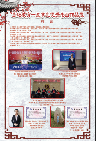 多年来,作为中央财政重点支持建设专业和黑龙江省重点专业,基础教育一系小学教育专业和语文教育专业在发展建设中,一直坚持传承“老师范”师范生基本功扎实过硬的优良传统,非常重视学生专业技能训练和考核工作,专业学生师范技能过硬,就业前景广阔。学生多人次在历年国家级和省级师范技能大赛中名列前茅、屡获佳绩,本次“学生优秀书画展”就是一次技能考核和成果的集中展示。