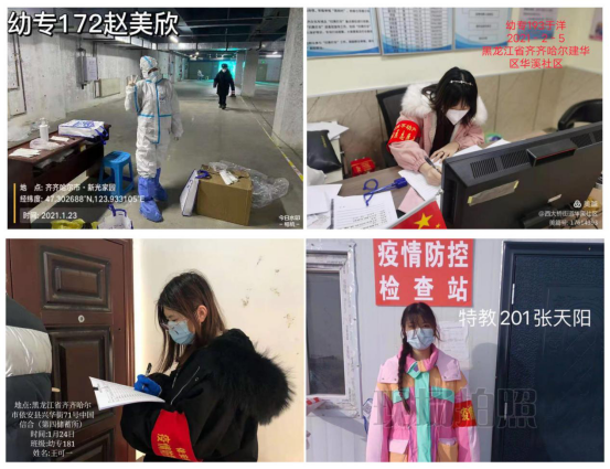 同时,在伟大英雄事迹和红色精神引领下,此次寒假期间,学前与特殊教育系有60余名学生参与到疫情防控志愿服务中,将所学所思所悟化为行动和力量,他们不怕辛苦、不畏寒冷,时刻诠释着当代青年的责任与担当。
