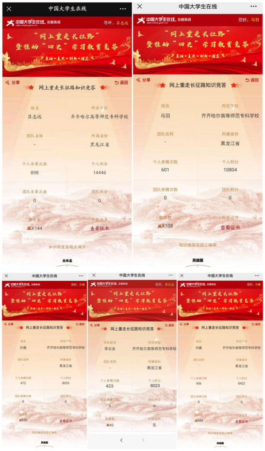 寒假期间,同学们通过线上关注“龙江高校网络思政中心”和“中国大学生在线”微信公众号开展学习,通知发布当日关注公众号并开展学习已达719人次。以“云博物馆”、“龙江精神”、“四史学习”等相关模块开展学习,并结合“四史问答”模块日打卡答题检验夯实学习成果。鲜活的案例、丰富的史料图片、生动的讲解,同学们追寻着红色的足迹,重温着红色的记忆,深刻感知到红色政权来之不易、新中国来之不易、中国特色社会主义来之不易。他们将本次学习的心得和成果化为文字记录于纸上,并通过微视频分享学习和成长的感悟。