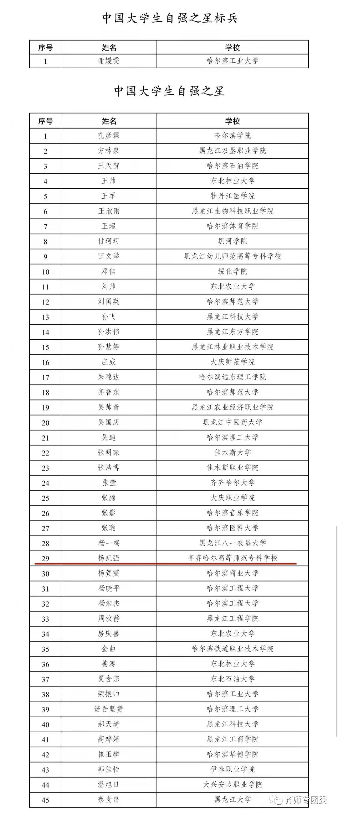 根据《关于推报2020年度“中国大学生自强之星”奖学金人选的通知》要求,经个人自荐、学校推荐、资格审查、专家评审,拟推荐谢嫒雯为“中国大学生自强之星标兵”候选人、孔彦霖等45人为“中国大学生自强之星”候选人。(按姓氏笔画排序)