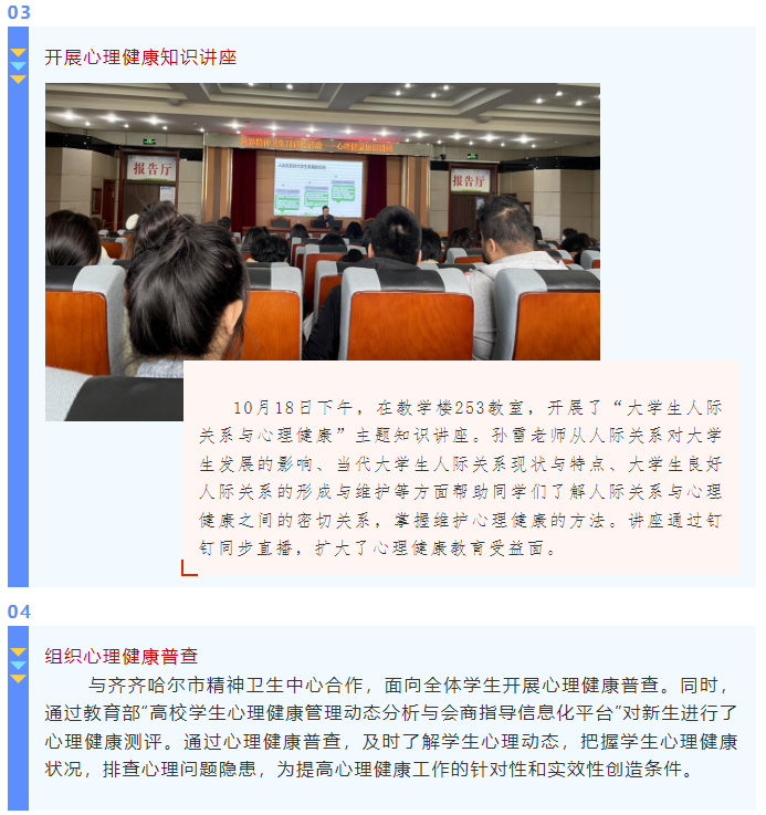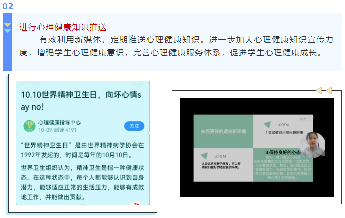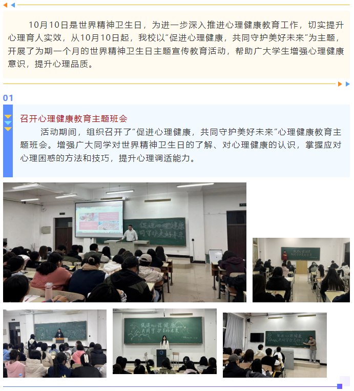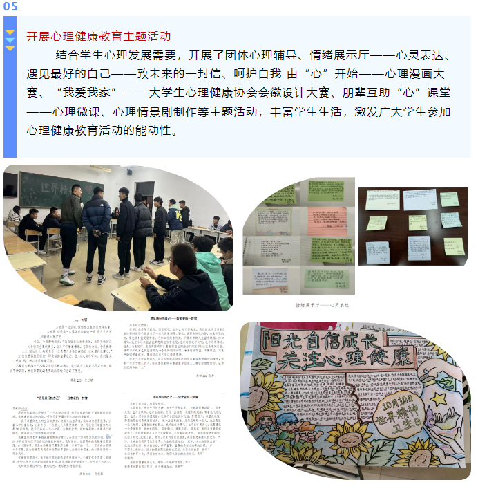 世界精神卫生日是心理健康教育工作中的重要节点,我校以“促进学生全面发展、健康成长”为总体目标,大力开展丰富多彩的教育活动,积极引领学生心理素质提升,切实筑起守护学生心理健康的坚强防线。