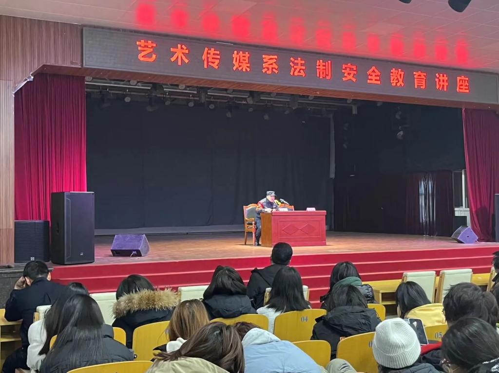 为进一步增强学生法制观念和守法意识,做到学法懂法、知法守法,自觉维护法律尊严,强化自身法律素质, 做一名新时代学法、知法、守法、用法的合格大学生。11月8日下午,艺术传媒系在校保卫处的支持下,邀请民航路派出所副所长郝建兴在大学生活动中心为2023级全体学生开展法制安全教育讲座。