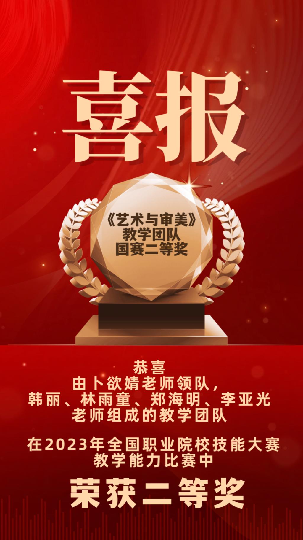 2023年11月25日全国职业院校技能大赛教学能力比赛在南昌落幕,由我校卜欲婧老师担任领队,韩丽、林雨童、郑海明、李亚光参赛教师组成的《艺术与审美》教学团队,在此次比赛中斩获二等奖。