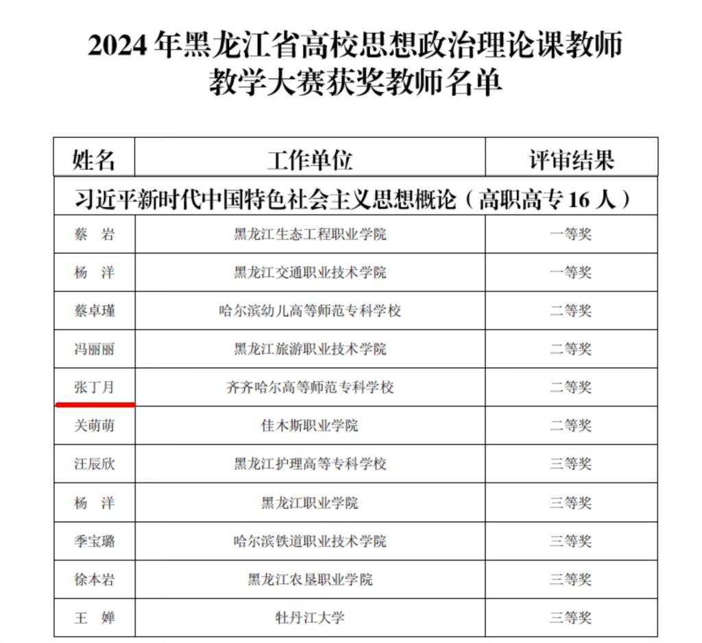 11月2日,由黑龙江省教育厅与省教科文卫体工会联合举办的2024年全省高校思想政治理论课教师教学大赛决赛在哈尔滨举办。全省高校262名思政课教师报名参赛,经过复赛环节,来自33所高校的60名教师进入决赛。参赛教师从10个备选专题中随机抽取展示专题,进行12分钟的现场展示。我校思政部教师张丁月经过激烈角逐,荣获省赛二等奖的好成绩。