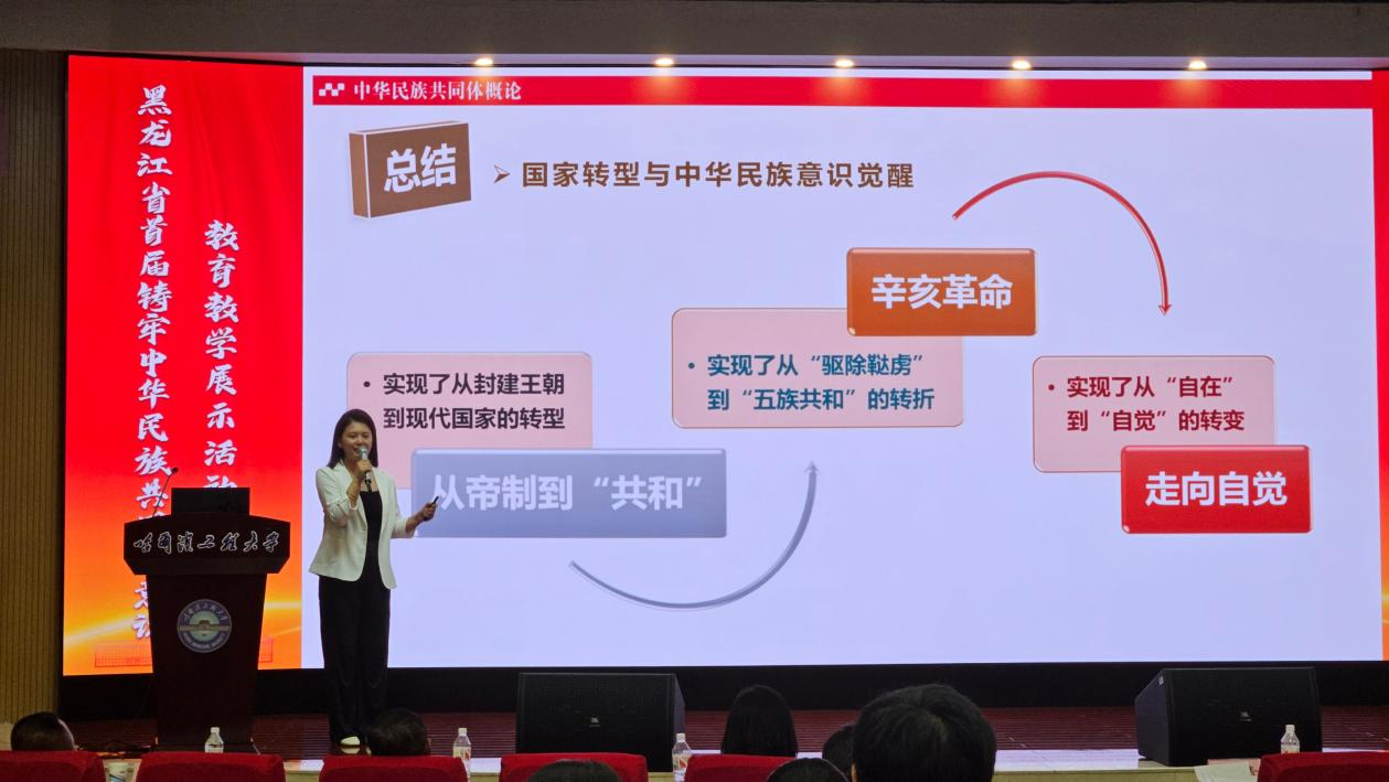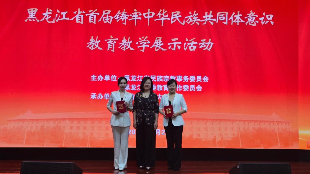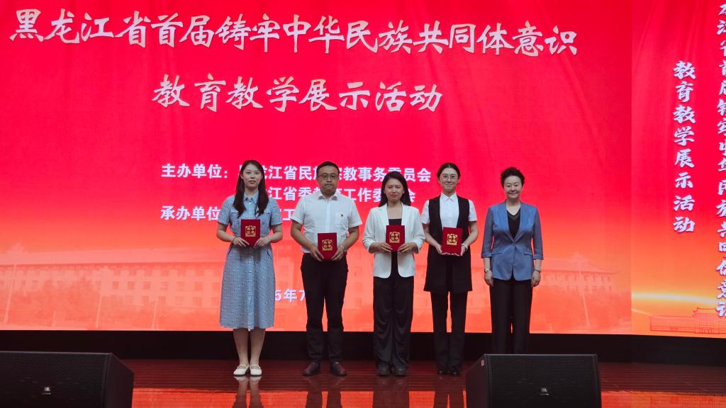 2025年7月2日,黑龙江省民宗委与省委教育工委联合举办的首届铸牢中华民族共同体意识教育教学展示活动在哈尔滨工程大学图书馆报告厅进行了现场决赛暨教学展示。经过激烈的角逐,我校思政部教师王金趾荣获高职高专组一等奖,张丁月老师荣获二等奖。