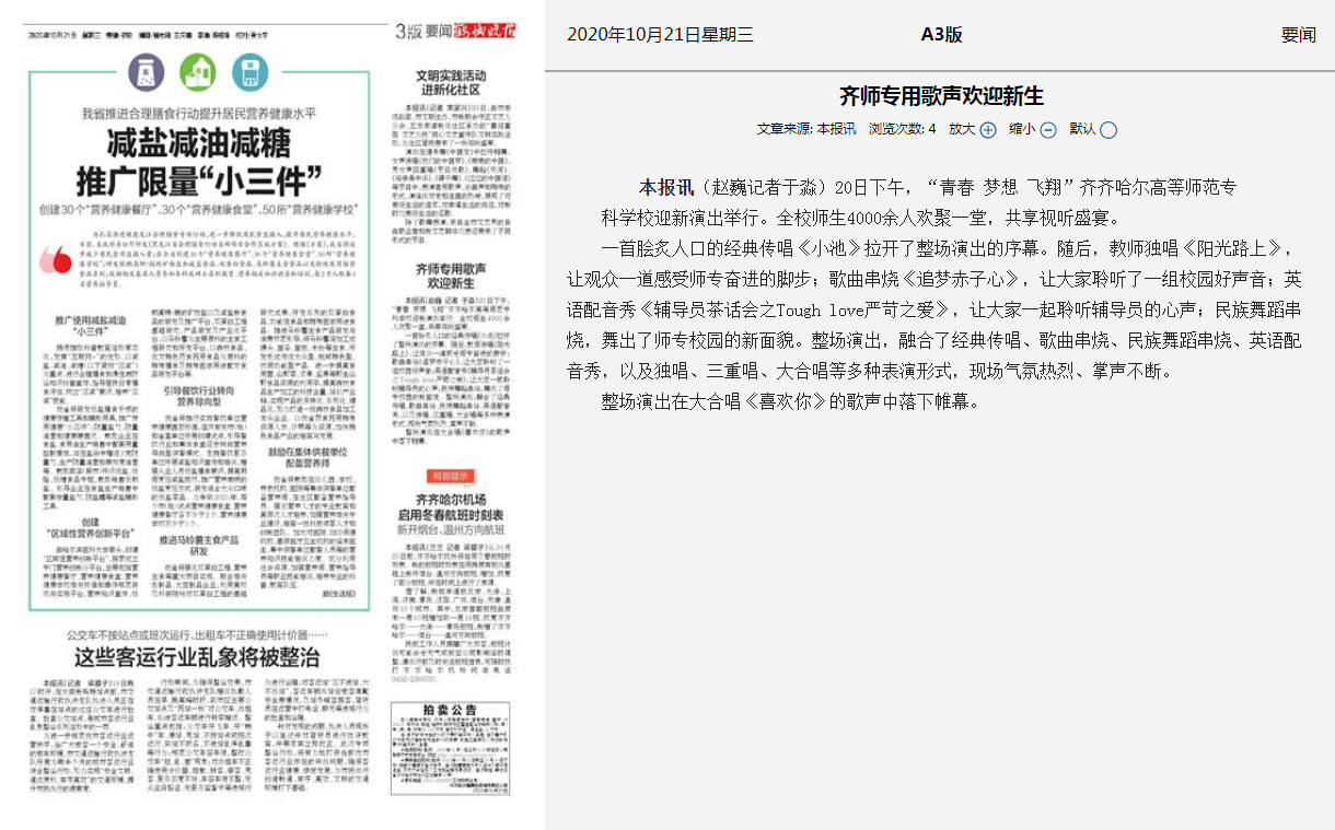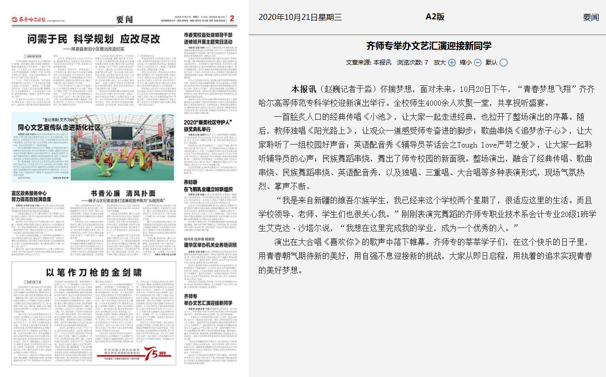 上一篇:齐齐哈尔电视台、齐齐哈尔新闻网 分别报道我校2020学年度迎新演出