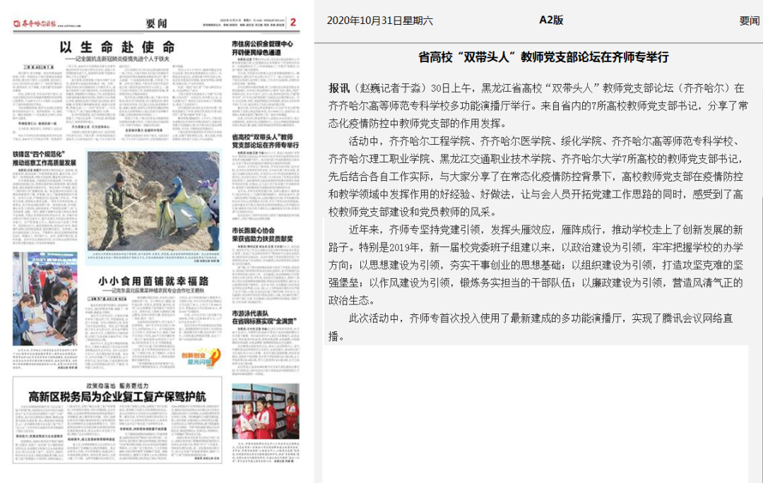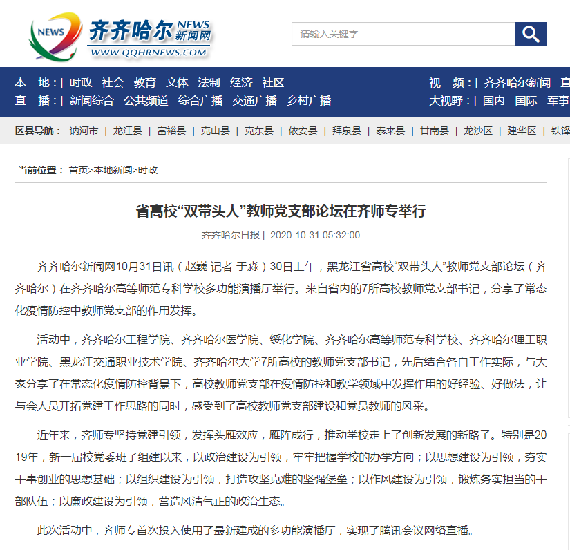 30日上午,黑龙江省高校“双带头人”教师党支部论坛(齐齐哈尔)在齐齐哈尔高等师范专科学校多功能演播厅举行。来自省内的7所高校教师党支部书记,分享了常态化疫情防控中教师党支部的作用发挥。
