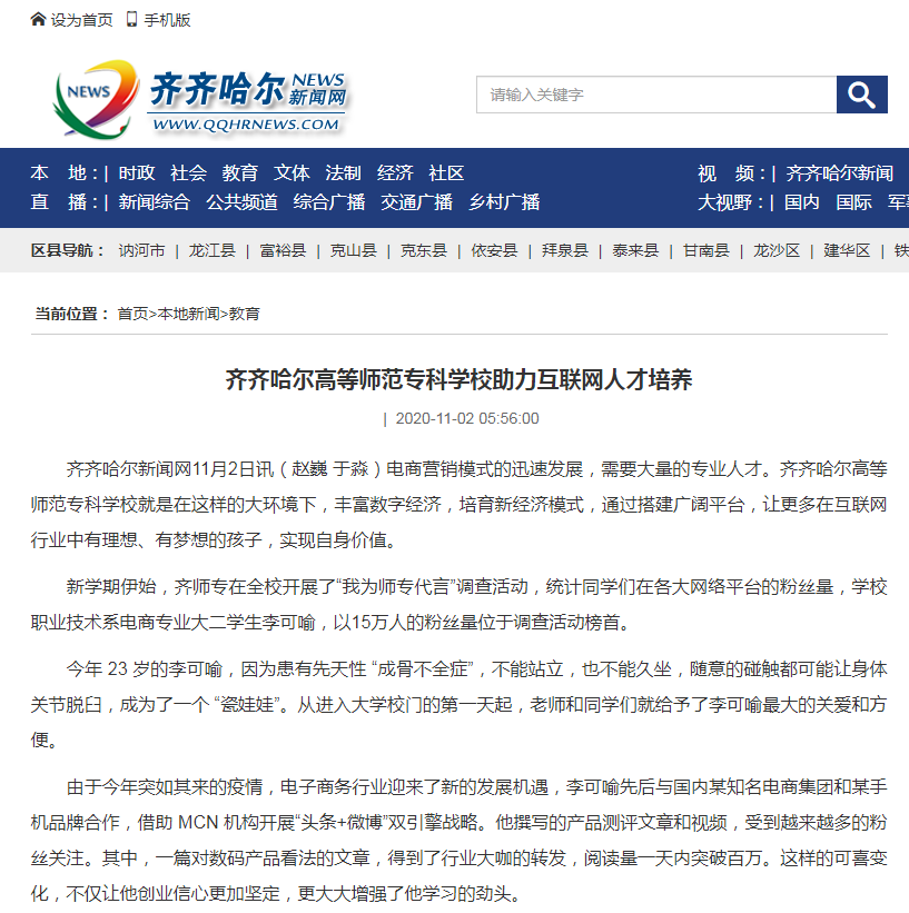 新学期伊始,齐师专在全校开展了“我为师专代言”调查活动,统计同学们在各大网络平台的粉丝量,学校职业技术系电商专业大二学生李可喻,以15万人的粉丝量位于调查活动榜首。