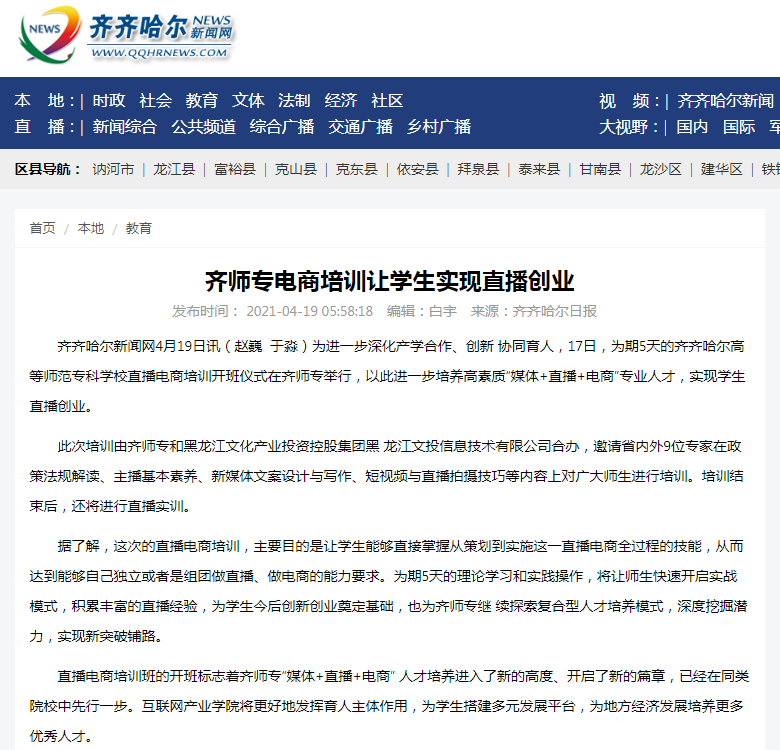 网址链接1:齐齐哈尔高等师范专科学校开启电商培训实战新模式