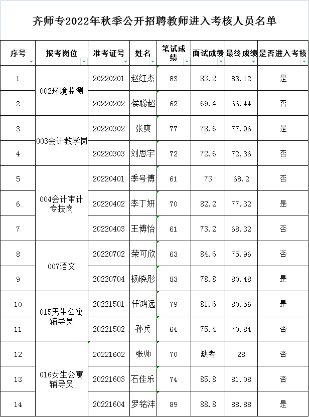 按照《齐齐哈尔高等师范专科学校2022年秋季公开招聘教师公告》要求,我校笔试、面试工作已经结束,现将应聘人员考试成绩及进入考核人员名单公布如下: