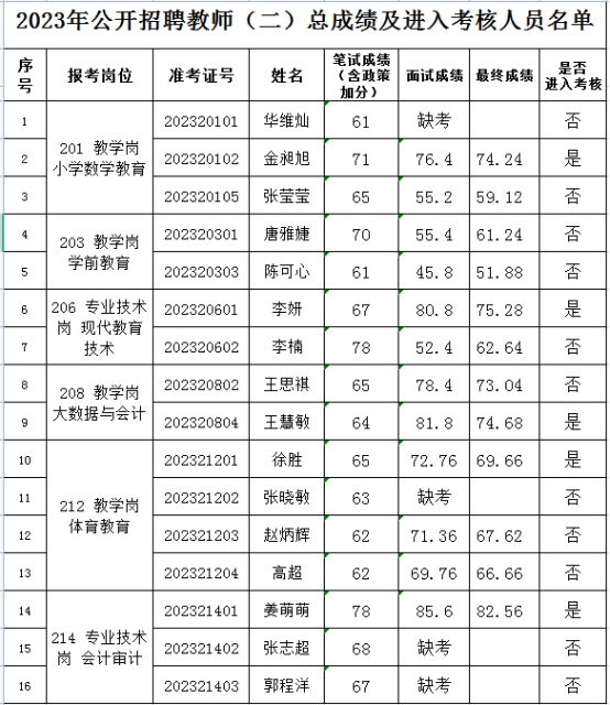 按照《齐齐哈尔高等师范专科学校2023年公开招聘教师公告(二)》要求,我校笔试、面试工作已经结束,现将应聘人员考试成绩及进入考核人员名单公布如下: