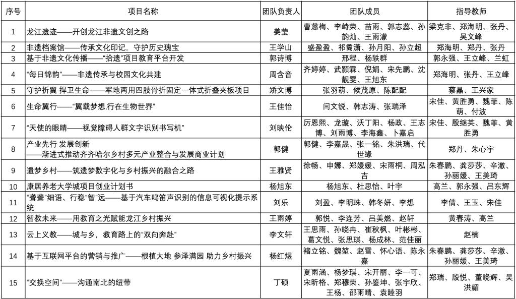 根据《关于举办第十四届“挑战杯”黑龙江省大学生创业计划竞赛的预通知》的文件要求,经个人申报、系部推荐、校赛选拔等环节,现对本次校级“挑战杯”赛事的15个入围项目予以公示,具体信息如下表: