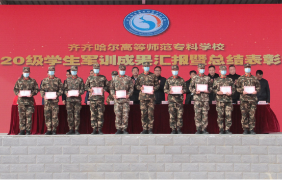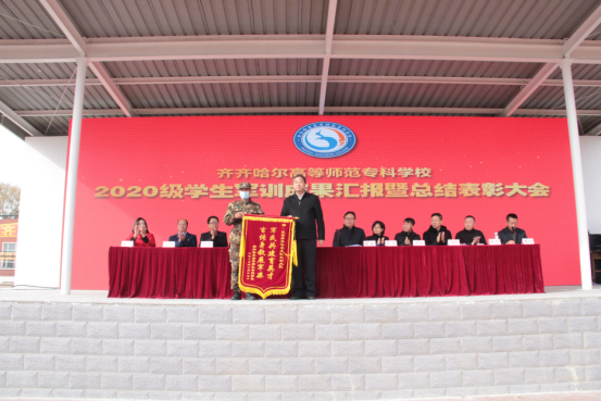 副校长于福军代表学校向武警齐齐哈尔支队机动大队赠送锦旗,表达学校对承训部队的真情赞誉;副校长金瓯宣读了2020级新生军训获奖名单,大会向获得军训先进集体、先进个人及优秀教官颁奖。