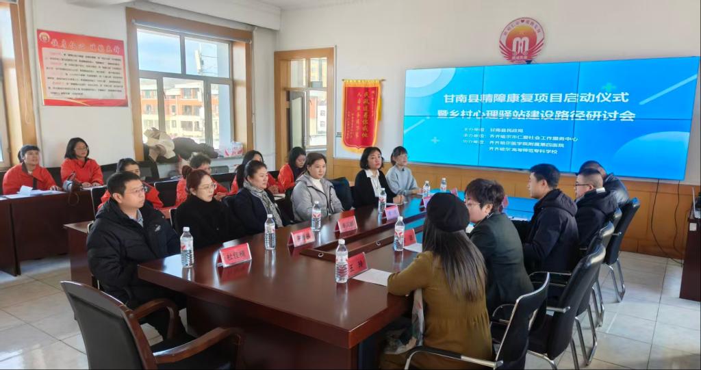 近日,由齐齐哈尔市甘南县民政局主办、齐齐哈尔市仁爱社会工作服务中心承办、齐齐哈尔医学院附属第四医院和齐齐哈尔高等师范专科学校协办的甘南县精神障碍项目启动仪式暨乡村心理驿站建设路径研讨会在甘南县民政局会议室顺利召开。我校“紫木匠心”心理工作室王玲老师、李兴娜老师受邀参加,研讨会从政策保障、医疗支持、专业学术等多个维度,为精障康复服务及乡村心理驿站建设提出指导性建议,共同探索精障患者康复服务新模式,擘画乡村心理驿站建设蓝图。