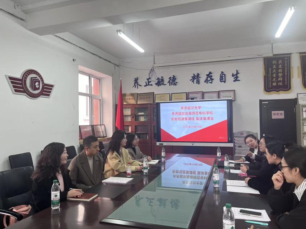 为深入贯彻《关于开展黑龙江省高校思政课“携手行动”的通知》,齐师专思想政治理论课教学科研部与齐齐哈尔大学马克思主义学院紧密联动,两校形势与政策课程教师开展集体备课活动。此次活动旨在深化两校课程教学协作,凝聚优质教学资源,共同提升《形势与政策》课程育人实效,为高校思政课建设注入新活力。